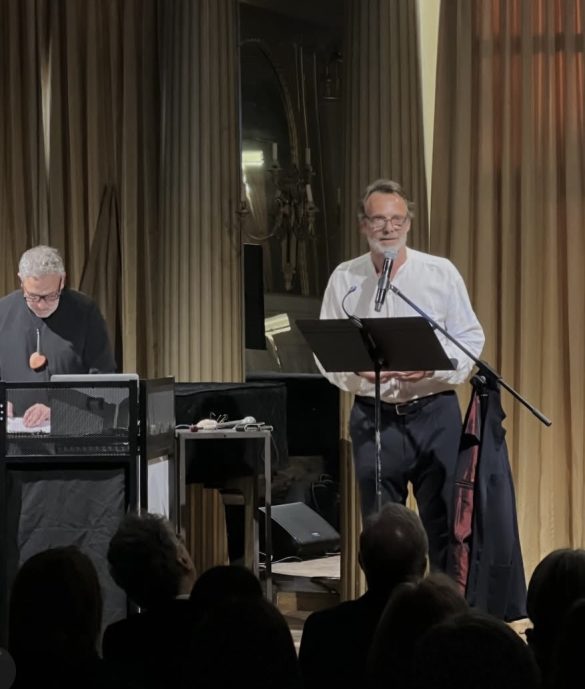 Accanto a lui, la presenza del musicista Giacomo Vezzani è tutt’altro che accessoria. Parola e musica si accompagnano e si rispondono. A tratti è la voce a dettare il ritmo, a tratti è la musica a prenderne il controllo, in un equilibrio sempre mobile. È proprio in questo dialogo tra voce e suono che lo spettacolo trova la sua struttura più profonda.